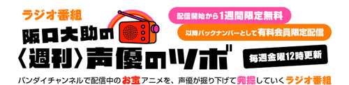バンダイチャンネルで好評配信中のラジオ番組「阪口大助の〈週刊〉声優のツボ」では、隔月恒例の公開収録が4月13日(日)に予定されており、その観覧募集が同番組配信ページにてスタートした。