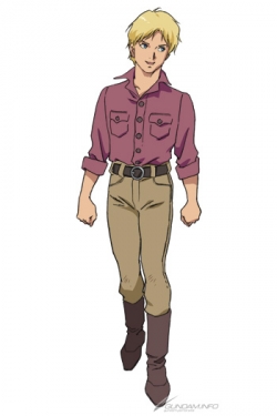 His true identity is Casval, son of Side 3 leader Zeon Zum Deikun. Having fled to Earth and been adopted by Teabolo Mass, he quickly matures in order to protect his younger sister Artesia (Sayla). Later, he will conceal his identity and become the Principality of Zeon's ace pilot Char Aznable. |