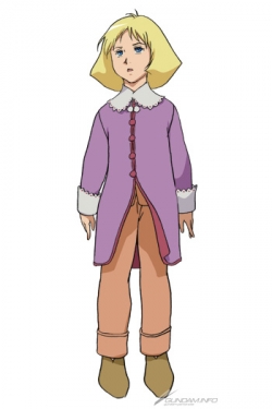 Her true identity is Artesia, son of Side 3 leader Zeon Zum Deikun. Having fled to Earth with her brother and pet cat, she lives a peaceful life with Teabolo Mass, growing into a kindly young woman who prays that no more tears of sorrow will ever be shed. |