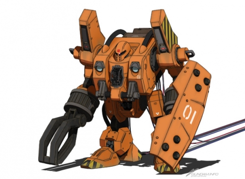 A prototype humanoid weapon designed for use by the Republic of Zeon in an eventual war of independence, currently under active development in a dark colony. The name "mobile walker" is an attempt to pass this machine off as intended for industrial use in lunar development. Its unique silhouette incorporates none of the sleek lines of a weapon of war, instead opting for an exposed cockpit and attachments including lights and a winch. Its right hand is a claw, apparently for demolition but also an effective weapon, and its left arm mounts a defensive shield. Combat tests against an early Guntank prove its potential as a next-generation weapons system. Its head mounts a single movable camera lens—the "monoeye". The mobile walker is powered by a back-mounted fusion reactor. Due to engineering difficulties, the reactor is oversized, reducing both speed and performance, and miniaturization is a top priority.