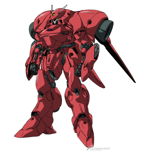 A revised version of the fourth Gundam Project suit, the Gerbera. Development was canceled after the internal frame was completed, and after its transfer to Cima, Zeon-style armor was added. During rollout, it featured two eyes, only later replaced with a Zeon-style monoeye.